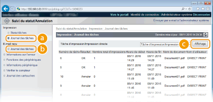 L'historique des impressions et l'historique des réceptions d'e-mail sont affichés sous forme de liste.