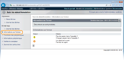 En cas d'erreur, cette page s'affiche lorsque vous cliquez sur le message figurant sous [Informations sur l'erreur] dans la page du portail (page principale).