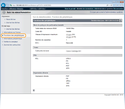Page du portail (page principale)Vérification des caractéristiques du périphérique