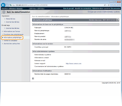 Des informations sur l'appareil et l'administrateur système sont affichées. Ces informations sont les informations qui ont été définies dans [Sécurité]