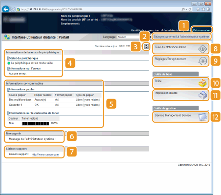 Affiche des informations sur le papier (quantité restante, format, etc.) et l'état des cartouches de toner.