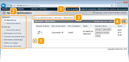Affiche la page [Suivi du statut/Annulation]. Vous pouvez utiliser cette page pour vérifier l'état actuel de l'impression, annuler le traitement de l'impression et consulter l'historique des tâches d'impression.