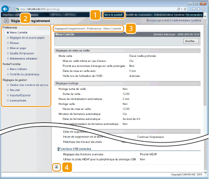 Menu sur la page [Réglages/Enregistrement]Vous ne pouvez modifier les réglages sur la page [Réglages/Enregistrement] que si vous êtes connecté en mode Administrateur. Si vous vous connectez en mode Utilisateur général, [Menu Utilitaire], [Contrôle du périphérique], [Gestion des numéros de service] et [Importer/Exporter] ne sont pas affichés. |