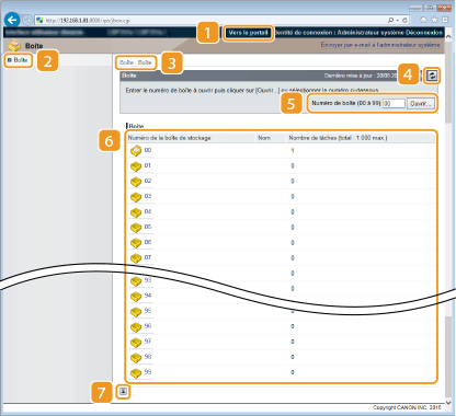 Affiche une liste de boîtes. Vous pouvez ouvrir une boîte pour vérifier les informations détaillées sur les documents stockés dans la boîte, imprimer et supprimer les documents.