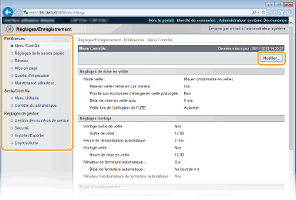 Licence/Autre | Vous pouvez modifier les messages affichés au tableau d'affichage et le lien vers la page de support qui sont affichés sur la page du portail (page principale). Vous pouvez enregistrer ou mettre à jour le logiciel (Guide pour l'enregistrement et la mise à jour des logiciels). |