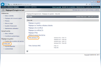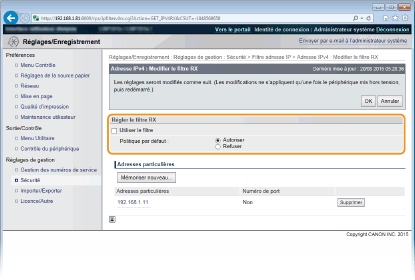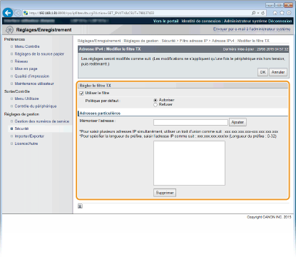 4 | Cochez la case [Utiliser le filtre] et cliquez sur la case d'option [Refuser] ou [Autoriser] pour la [Politique par défaut ]. [Utiliser le filtre] Cochez la case pour limiter les communications. Désactivez-la pour désélectionner la restriction. [Politique par défaut ] Sélectionnez la condition préalable pour autoriser ou rejeter les échanges d'autres périphériques avec l'appareil. [Autoriser] | Cliquez sur cette case d'option pour bloquer uniquement les paquets de communication envoyés ou reçus par les périphériques correspondant aux adresses IP spécifiées dans [Adresses particulières]. Les communications avec d'autres périphériques sont autorisées. | [Refuser] | Cliquez sur cette case d'option pour laisser passer uniquement les paquets de communication envoyés ou reçus par les périphériques correspondant aux adresses IP spécifiées dans [Adresses particulières]. Les communications avec d'autres périphériques sont interdites. |