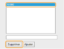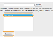 Modification d'une adresse IP des exceptions Cliquez sur le lien texte correspondant sous [Adresses particulières], dans l'écran qui s'affiche changez les réglages adéquats puis cliquez sur [OK]. Suppression d'une adresse IP des exceptions Sélectionnez une adresse IP à supprimer, puis cliquez sur [Supprimer]. |