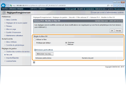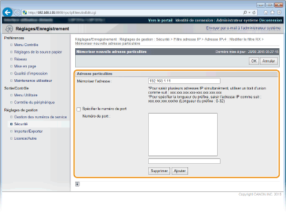 2 | Indiquez les exceptions voulues. Saisissez l'adresse IP (ou la plage d'adresses IP) dans [Mémoriser l'adresse ]. Pour spécifier un numéro de port, cochez la case [Spécifier le numéro de port], saisissez un numéro de port dans [Numéro de port], puis cliquez sur [Ajouter]. Vérifiez si vous n'avez pas fait d'erreurs de saisie En cas de saisie incorrecte des adresses IP ou des numéros de port, vous risquez de ne pas pouvoir accéder à l'appareil via l'interface utilisateur distante. Si cela devait se produire, il faudrait régler <Filtre d'adresse> sur <Non>. Filtre d'adressePour supprimer un numéro de port spécifié Sélectionnez le numéro de port à supprimer et cliquez sur [Supprimer]. |