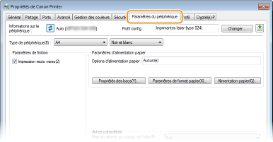 Cliquez sur l'onglet [Paramètres du périphérique] et spécifiez les réglages nécessaires.