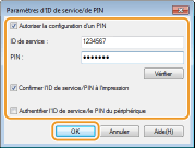 2 | Spécifiez les réglages si nécessaire et cliquez sur [OK]. [Autoriser la configuration d'un PIN] Cochez la case pour autoriser la configuration d'un PIN. [ID de service] Saisissez l'ID de service. [PIN] Saisissez le code PIN correspondant à l'ID de service, si nécessaire. [Vérifier] Cliquez sur ce lien pour vérifier si le numéro et le PIN saisis sont corrects. Cette fonction n'est pas disponible si l'appareil et l'ordinateur sont reliés par un port USB ou WSD (Web Services on Devices). [Confirmer l'ID de service/PIN à l'impression] Cochez la case pour afficher la fenêtre contextuelle [Confirmer l'ID de service et le PIN] à chaque fois que vous lancez une impression à partir d'un ordinateur. [Authentifier l'ID de service/le PIN du périphérique] Cochez la case si l'appareil et l'ordinateur sont reliés par un port USB ou WSD (Web Services on Devices). |