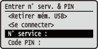 Si la gestion des ID de service est activéeLorsque les utilisateurs essaient d'imprimer un fichier stocké dans le périphérique mémoire USB ou un document stocké sur la carte SD depuis le panneau de commande, l'écran d'authentification s'affiche. Saisissez l'ID de service et le code PIN, sélectionnez <Se connecter> et appuyez sur  . | |
