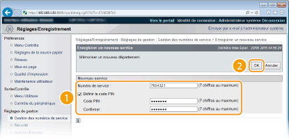 2 | Spécifiez les réglages requis et cliquez sur [OK]. [Numéro de service] Saisissez l'ID de service à enregistrer. [Définir le code PIN] Pour définir un code PIN, cocher la case et saisissez le même numéro dans les zones de texte [Code PIN] et [Confirmer]. |