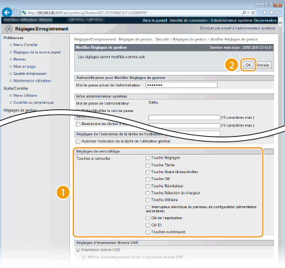 Vous pouvez cocher la case correspondant à une touche pour verrouiller cette dernière même lorsque l'on appuie dessus sur le panneau de commande. Décochez la case pour déverrouiller la touche. Vous pouvez aussi verrouiller la touche Configuration depuis le panneau de commande (Gest réglages).