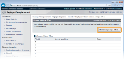 Activation des communications IPSec). Une politique de sécurité est constituée des groupes de réglages décrits ci-dessous. Vous pouvez enregistrer plusieurs politiques en fonction d'une combinaison de l'adresse IP et du numéro de port. Une fois l'enregistrement des politiques terminé, indiquez l'ordre dans lequel elles sont appliquées.