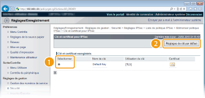 2 | Sélectionnez la paire de clé à utiliser et cliquez sur [Réglages de clé par défaut]. Affichage des détails d'une paire de clés ou d'un certificat |