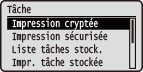 Astérisques (*)Les réglages signalés par "*1" ne s'affichent pas sur tous les modèles ou avec tous les équipements en option ou toutes les options de réglage. Les réglages signalés par "*2" ne s'affichent pas si la case [Afficher le journal des tâches] de l'interface utilisateur distante n'est pas cochée. Masquage de l'historique des tâches d'impression |