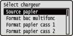 ![]() | Les réglages relatifs à l'alimentation papier et au format du papier chargé dans l'appareil sont répertoriés et accompagnés d'une brève description. Lorsque vous appuyez sur ( ) sur le panneau de commande, le menu Sélectionnez l'alimentation s'affiche. Les réglages par défaut sont signalés par une croix ( ). |