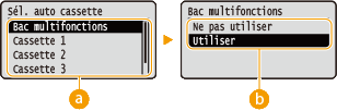 Auto ![]() Bac multifonctions Cassette 1 Cassette 2 * Cassette 3 * Cassette 4 * |