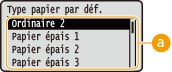 L'impression sera exécutée avec le papier du type sélectionné ici si [Type de papier ] est réglé sur [Paramètre par défaut de l'imprimante] dans le pilote d'imprimante et si le type de papier est réglé sur <Types mixtes> sur l'appareil pour le papier chargé dans l'alimentation papier. |