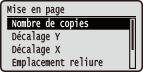 Vous pouvez sélectionner <Ajus. position impr.> sous <Maintenance utilis.> pour affiner la position d'impression pour chaque alimentation papier. La plage de valeurs de décalage disponible va de -0,20" à +0,20" (-5,0 mm à +5,0 mm). Réglage de la position d'impression |