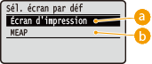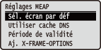 ![]() | Tous les réglages relatifs à l'écran principal sur MEAP sont répertoriés et accompagnés d'une brève description. Les réglages par défaut sont signalés par une croix ( ). |