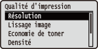 Activez ou désactivez le mode Lissage qui permet de lisser l'impression des bords des caractères et des graphiques. <Lissage image> n'est pas affiché quand <Résolution> est réglé sur <1 200 dpi>.