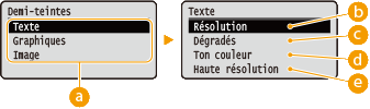 Vous pouvez sélectionner le mode d'impression pour reproduire les demi-teintes (plage intermédiaire entre les zones claires et les zones foncées d'une image) pour obtenir une qualité d'image optimale. Vous pouvez spécifier les demi-teintes pour chaque type de données d'image dans un même document.