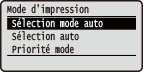 Si tous les modes d'impression sont réglés sur <Non>, l'appareil fonctionne dans le mode d'impression sélectionné pour <Priorité mode>. |