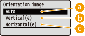 Si le réglage spécifié (<Vertical(e)> ou <Horizontal(e)>) n'est pas adapté à l'orientation de l'image, l'image imprimée est réduite. |