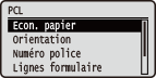 ![]() | Tous les réglages relatifs aux commandes de contrôle PCL sont répertoriés et accompagnés d'une brève description. Les réglages par défaut sont signalés par une croix ( ). |