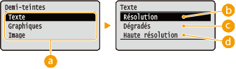 Vous pouvez sélectionner le mode d'impression pour reproduire les demi-teintes (plage intermédiaire entre les zones claires et les zones foncées d'une image) pour obtenir une qualité d'image optimale. Vous pouvez spécifier les demi-teintes pour chaque type de données d'image dans un même document.