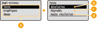 Vous pouvez sélectionner le mode d'impression pour reproduire les demi-teintes (plage intermédiaire entre les zones claires et les zones foncées d'une image) pour obtenir une qualité d'image optimale. Vous pouvez spécifier les demi-teintes pour chaque type de données d'image dans un même document.