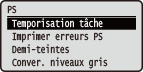 | Tous les réglages relatifs aux commandes de contrôle PS sont répertoriés et accompagnés d'une brève description. Les réglages par défaut sont signalés par une croix (  ). |