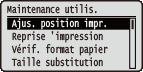 ![]() | Les réglages de l'appareil, notamment ceux concernant la correction de la position d'impression pour chaque alimentation papier et l'amélioration de la qualité d'impression, sont répertoriés et accompagnés d'une brève description. Vous pouvez spécifier ces réglages lorsque l'appareil est hors ligne. Les réglages par défaut sont signalés par une croix ( ). |