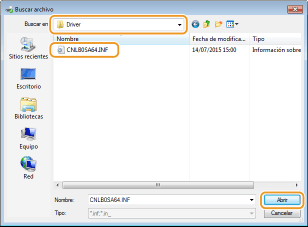 4 | Especifique la carpeta que contiene controladores adicionales, seleccione el archivo INF y haga clic en [Abrir]. ![]() Seleccione la carpeta tal como se muestra a continuación según el sistema operativo del servidor de impresión. Si el servidor de impresión utiliza un sistema operativo de 32 bits Seleccione la carpeta [UFR II]-su idioma-[x64]-[Driver] (Controlador) en el User Software CD-ROM/DVD-ROM. Si el servidor de impresión utiliza un sistema operativo de 64 bits Seleccione la carpeta [UFR II]-su idioma-[32BIT]-[Driver] (Controlador) en el User Software CD-ROM/DVD-ROM. | ||||||