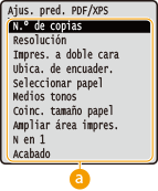 Las opciones que se muestran inicialmente para especificar la configuración de impresión se denominan opciones predeterminadas. Si cambia estas opciones predeterminadas para adaptarlas a las operaciones que realiza con mayor frecuencia, puede eliminar la necesidad de especificar las mismas opciones cada vez que imprima.