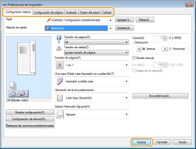 Especifique las opciones de impresión según sea necesario y haga clic en [Aceptar].