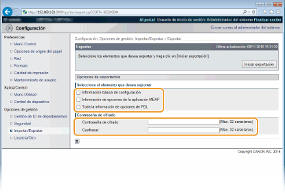 Introduzca la contraseña para cifrar los datos que desee exportar empleando caracteres. Introduzca la misma contraseña en [Confirmar]. Si no se configura ninguna contraseña, será imposible exportar datos.