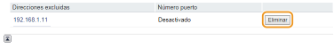 Edición de una dirección IP de las excepciones Haga clic en el vínculo de texto correspondiente que aparece debajo de [Direcciones excluidas] en la pantalla que se ha mostrado, cambie las opciones como desee y haga clic en [Aceptar]. Eliminación de una dirección IP de las excepciones Seleccione una dirección IP para eliminar y haga clic en [Eliminar]. |