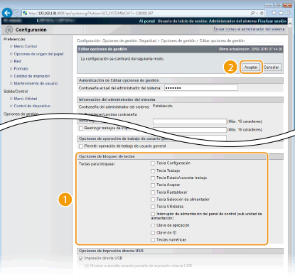 Puede seleccionar la casilla de verificación para bloquear la tecla correspondiente aunque se pulse en el panel de control. Para desbloquear la tecla, quite la marca de la casilla de verificación. También puede bloquear la tecla de Configuración desde el panel de control (