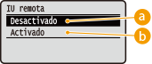 La IU Remota resulta útil porque las opciones del equipo pueden especificarse utilizando un navegador web en un ordenador. Para utilizar la IU Remota, el equipo debe conectarse a un ordenador a través de la red. Si el equipo está conectado a un ordenador a través de la conexión USB, o si no necesita utilizar la IU Remota, puede deshabilitar la IU Remota para reducir el riesgo de que terceras personas malintencionadas controlen su equipo de forma remota a través de la red.