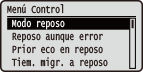 Niveles de modos de reposoEl efecto de reducción del consumo de energía es menor con <Med. (Reposo impr.)> y mayor con <Alto (Reposo)>. Si utiliza un software de utilidad asociado a una redSi configura el modo de reposo en <Alto (Reposo)>, el software de utilidad puede dar un error de comunicación. |