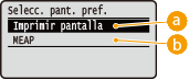 ![]() | Los elementos de configuración de la pantalla principal en MEAP se muestran con descripciones breves. Las opciones predeterminadas aparecen marcadas con una cruz ( ). |