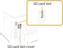 This section describes how to mount and initialize an SD card. Insert the SD card into the SD card slot on the back side of the machine. Read the precautions in Installation before installing the SD card. Note that the data in the machine that is stored to the SD card is all subjected to encryption. This ensures safe use of the SD card on a computer or in other situation because the encrypted data in the SD card is protected against unauthorized extraction. | ![]() |