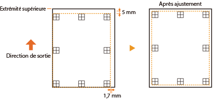 Vous pouvez utiliser la fonction "Imprimer ajustement de la position d'impression" pour vérifier dans quelle direction et sur quelle distance faire l'ajustement.