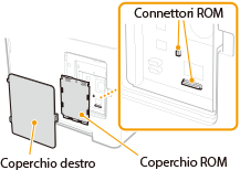 Questa sezione descrive come installare il Barcode Printing Kit o il PCL International Font Set nella macchina. La ROM si collega ai connettori ROM all'interno del coperchio destro della macchina. Prima di installare la ROM, leggere le precauzioni in Installazione. | ![]() |