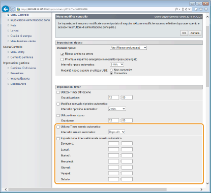 Selezionare la casella di controllo per spegnere la macchina una volta trascorso il tempo indicato in [Intervallo arresto automatico].