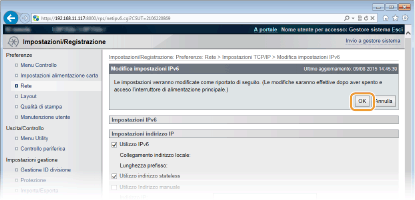 Verificare che le impostazioni siano corretteVerificare che la schermata della IU remota possa essere visualizzata sul computer tramite l'indirizzo IPv6 della macchina. Avvio della IU remotaSelezione delle impostazioni dal pannello operativoÈ possibile abilitare o disabilitare gli indirizzi IPv6 anche dal menu delle impostazioni del pannello operativo. Impostazioni IPv6Se l'indirizzo IP è stato modificato dopo aver installato il driver della stampante |