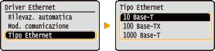 3 | Selezionare il tipo di Ethernet. Selezionare <Tipo Ethernet> Selezionare il tipo di Ethernet ![]() ![]() ![]() Quando si seleziona <1000 Base-T>, l'impostazione per <Mod. comunicazione> diventa <Full Duplex>. |