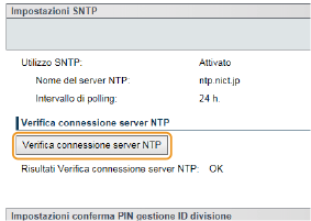 Verifica della comunicazione con il server NTP/SNTPÈ possibile visualizzare lo stato della comunicazione con il server registrato facendo clic su [Impostazioni/Registrazione] [Rete] [Impostazioni TCP/IP] e quindi su [Verifica connessione server NTP] nelle [Impostazioni SNTP] che vengono visualizzate. Se la connessione è stata stabilita correttamente, il risultato viene visualizzato come illustrato di seguito. Tenere presente che questa operazione non regola l'orologio di sistema.![]() Selezione delle impostazioni dal pannello operativoÈ possibile abilitare o disabilitare le impostazioni SNTP anche dal menu delle impostazioni del pannello operativo. SNTP |